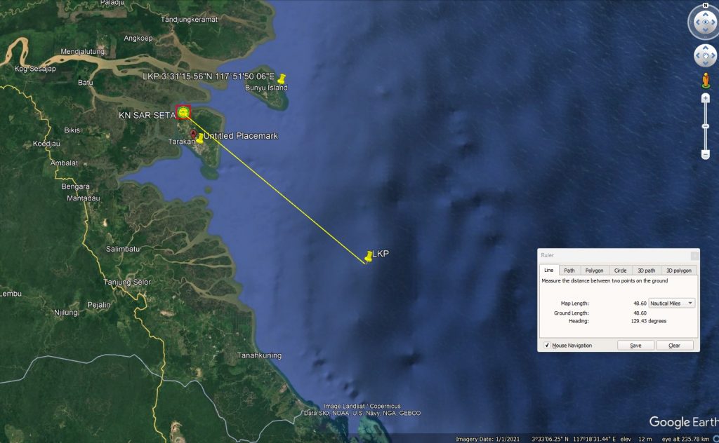 Lokasi kejadian di perairan Kalimantan Utara, pada koordinat 2°53′.55″N 118°10′.94″E. Dengan jarak tempuh +/- 51 Nautical Miles menggunakan Google Maps dengan waktu tempuh kurang lebih 4 jam dari Tarakan.