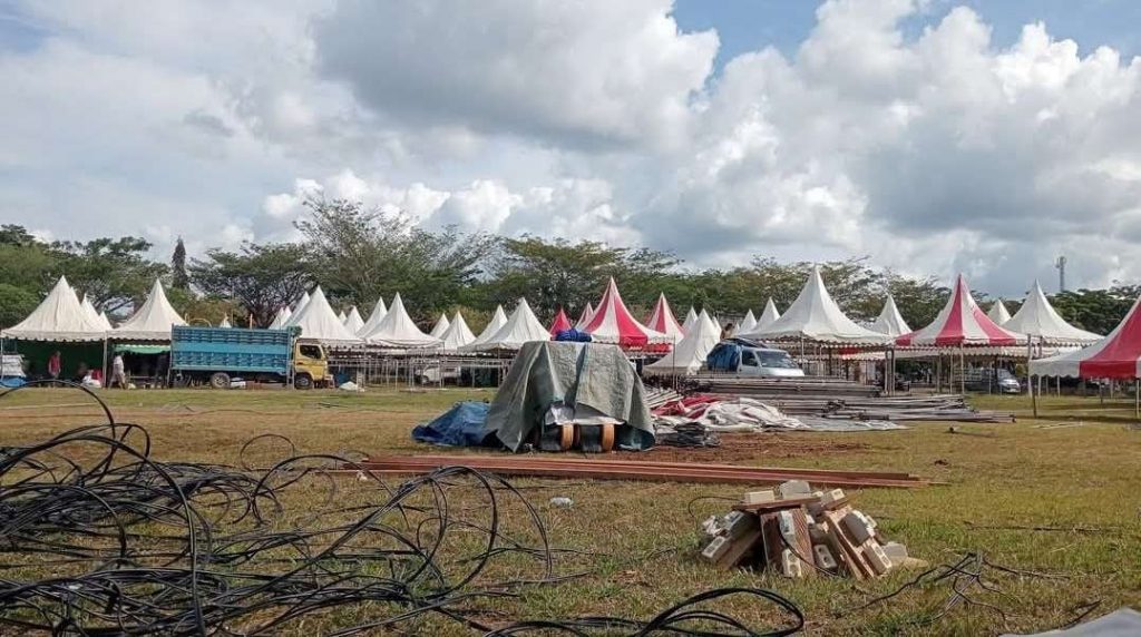 Beragam aktivitas tampak di area ekspo. Mulai dari pemasangan tenda, penataan produk, hingga dekorasi stan agar tampil menarik di hadapan pengunjung.