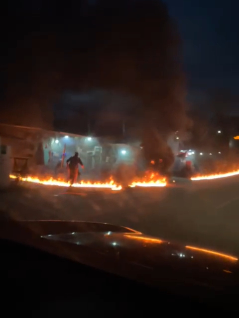 Kemudian api terlihat membentuk garis di sepanjang jalan aspal saat mobil tersebut melaju meninggalkan warung dalam kondisi tangki BBM masih terbuka dan api masih menyala.